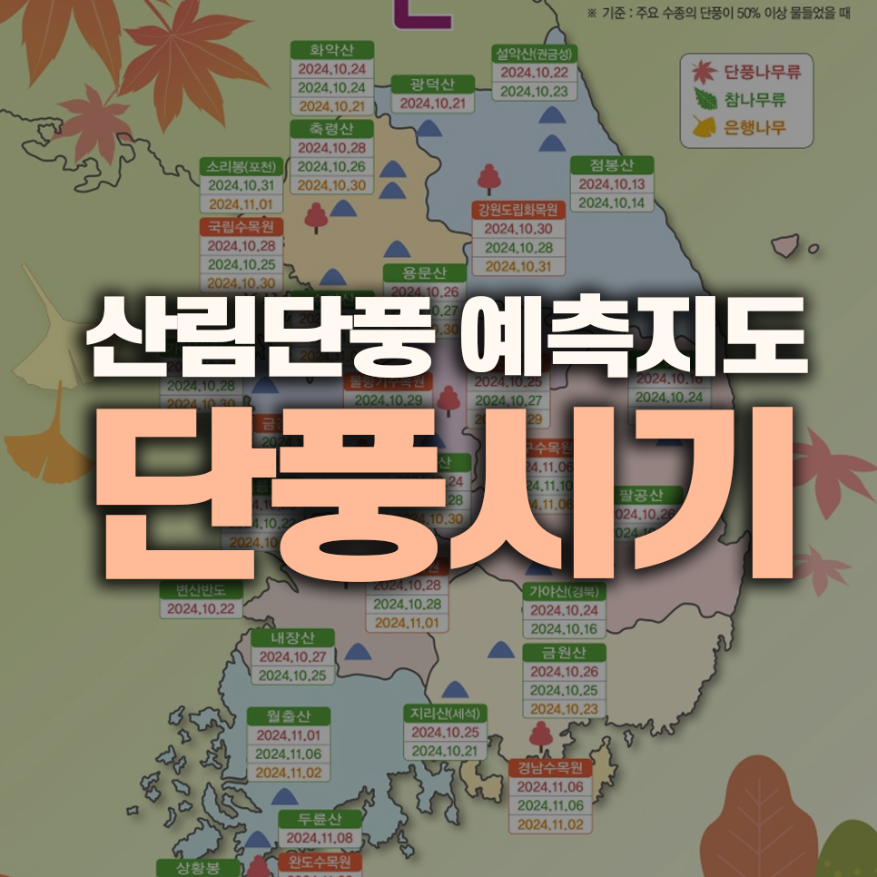 이번 2024년 지도는 참나무류, 단풍나무류, 은행나무를 중심으로 전국적으로 단풍 절정 시기를 예측한 자료입니다.