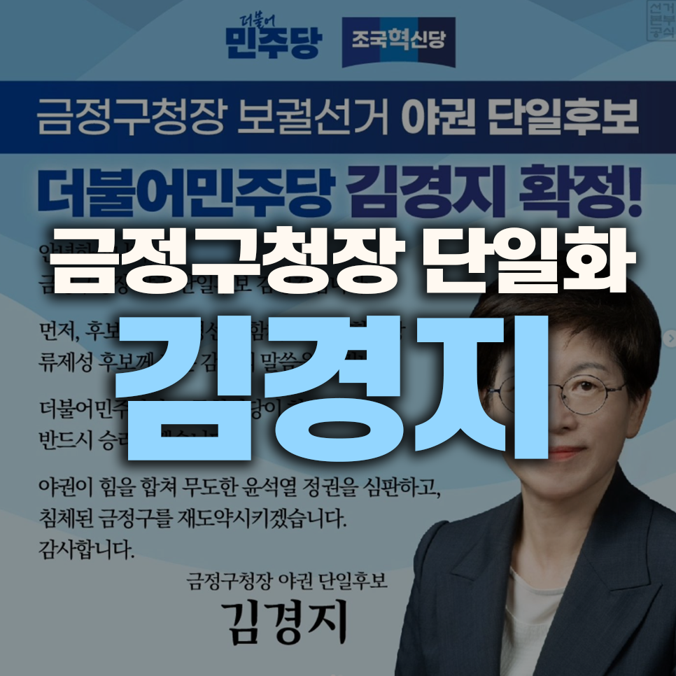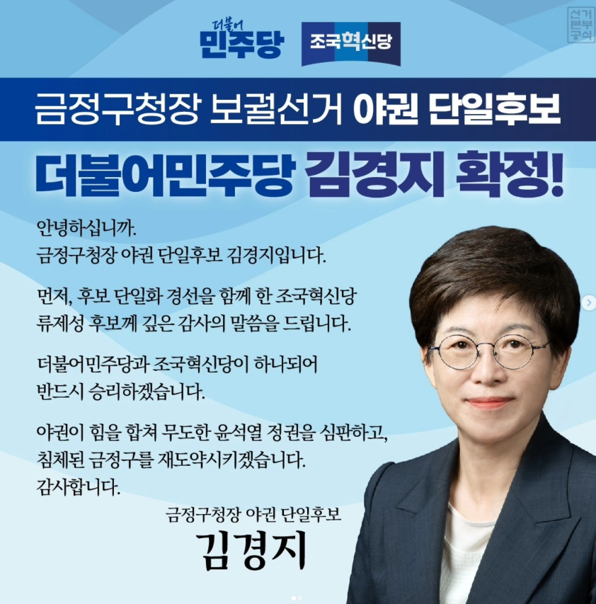 부산 금정구청장 보궐선거에서 더불어민주당과 조국혁신당은 김경지 후보를 단일 후보로 선출했습니다.