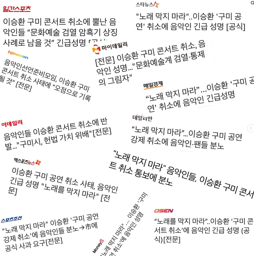 그러나 공연 이틀 전, 갑작스럽게 구미시는 이승환 측에 대관 취소를 통보했습니다.
